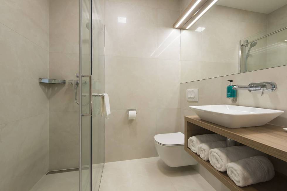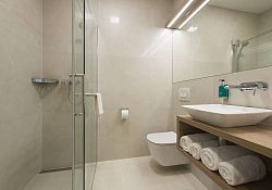 doccia, toilette, lavandino e asciugamani